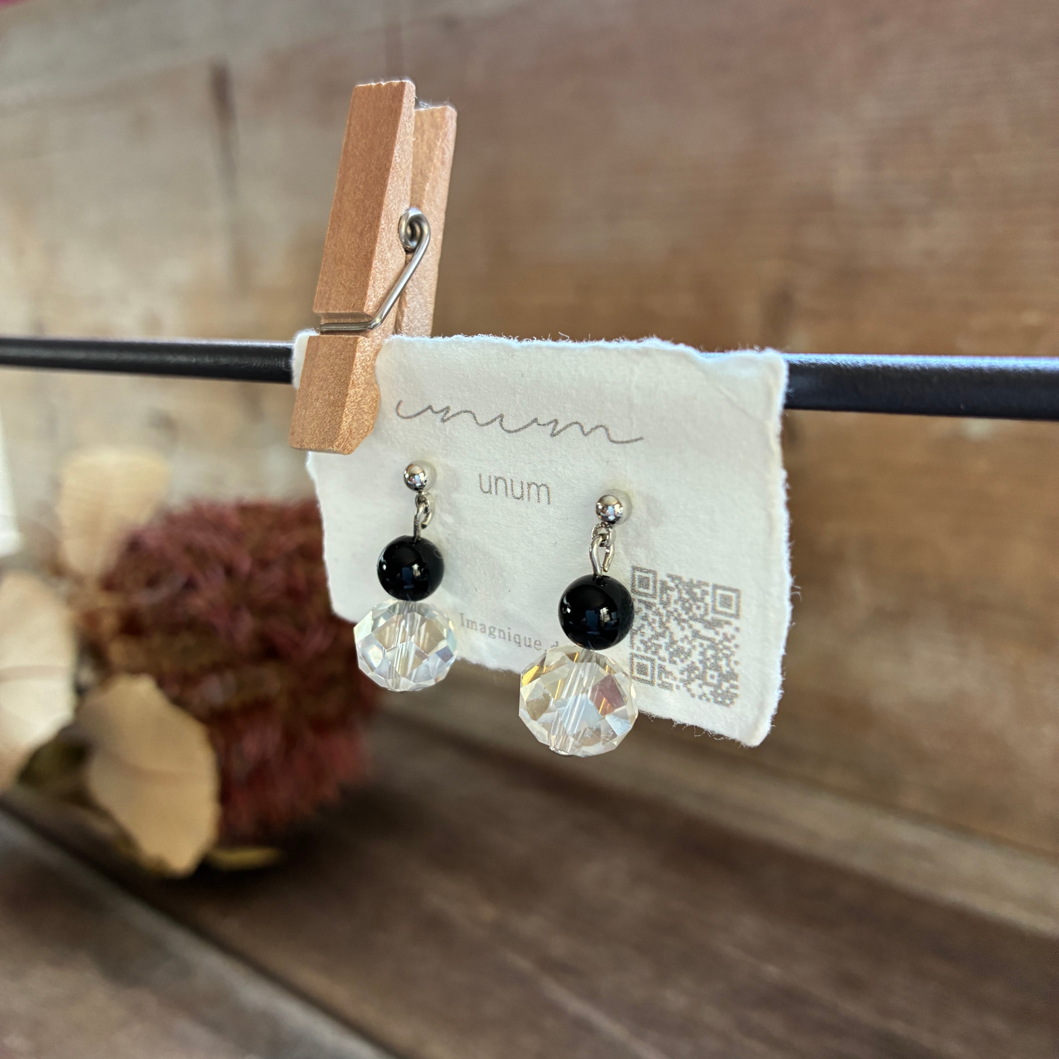 つややかな黒が映えるオニキスに、きらっと輝くクリアビーズを合わせたシンプルなデザイン。