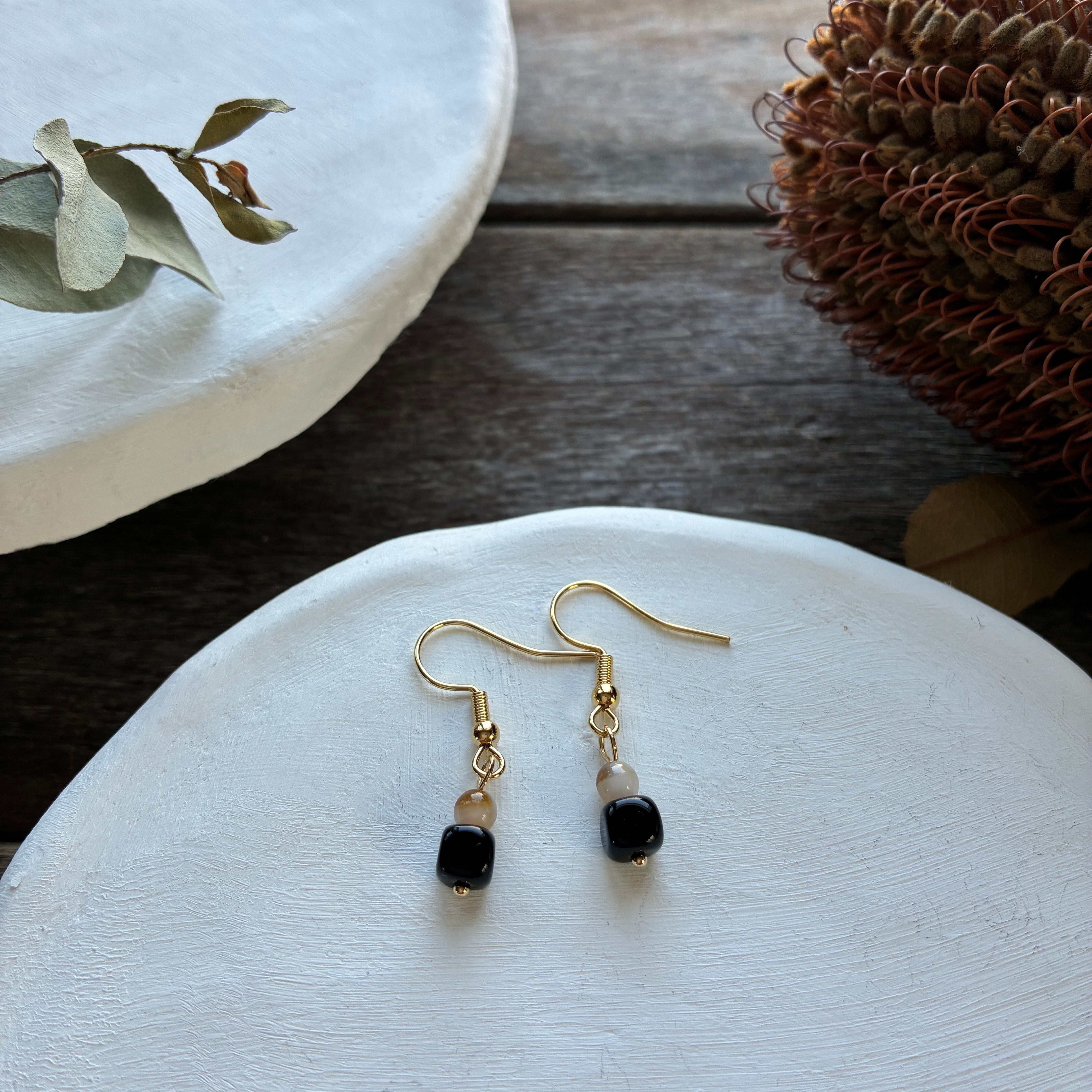 つや感のあるブラックビーズに、やわらかなベージュビーズを合わせたシンプルなデザイン。