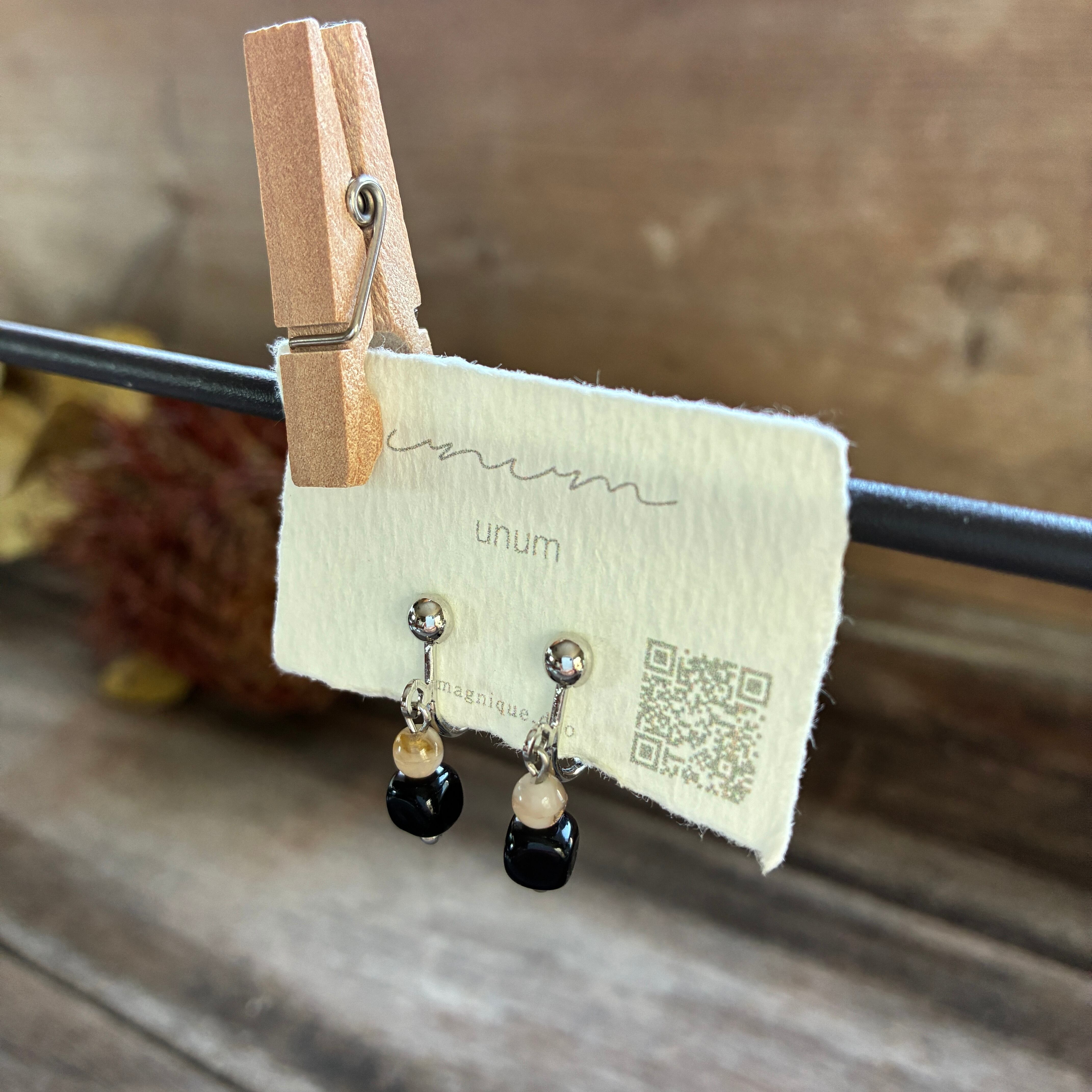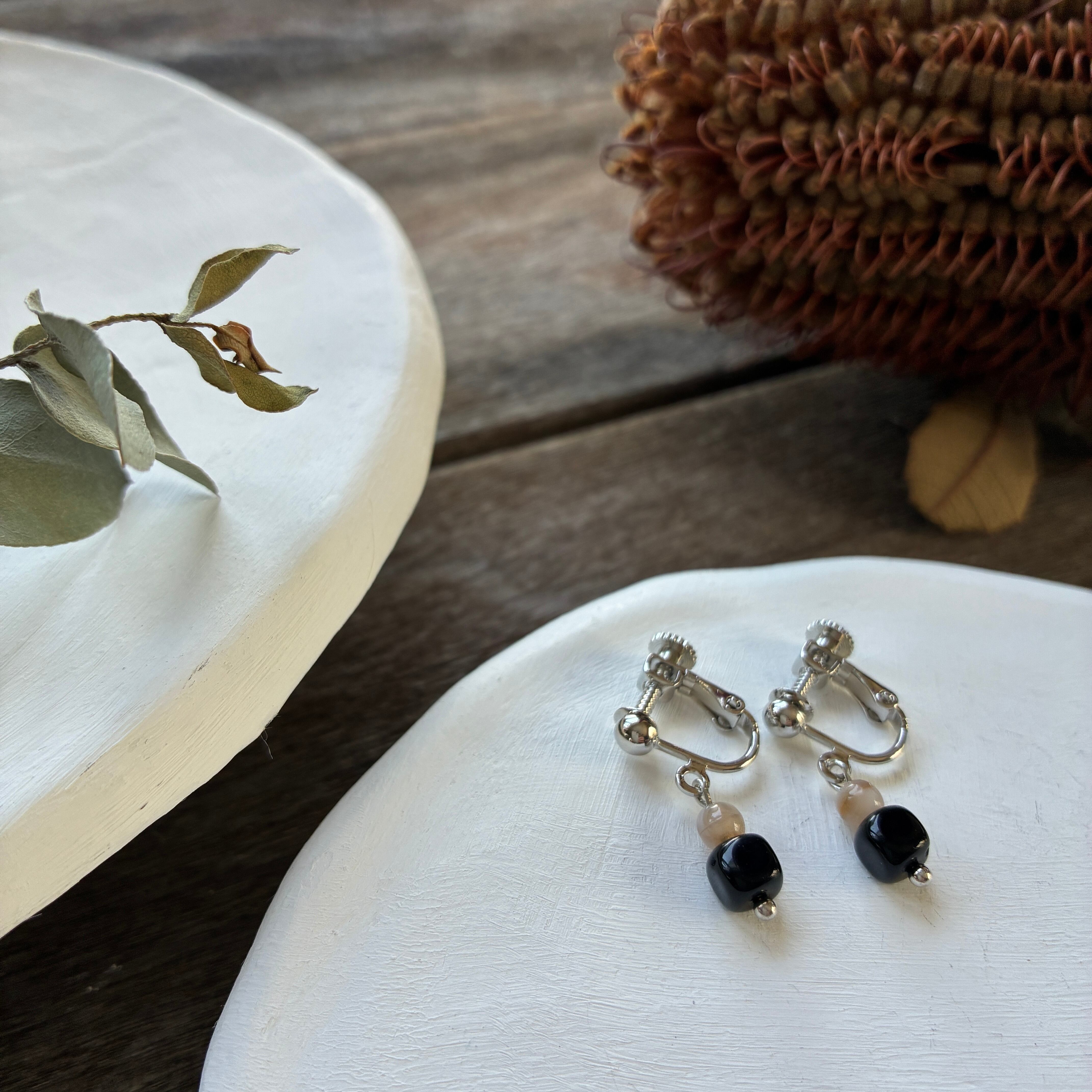 つや感のあるブラックビーズに、やわらかなベージュビーズを合わせたシンプルなデザイン。